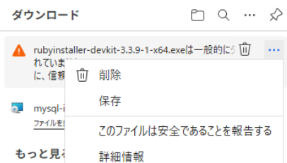 見慣れないメッセージが出てきました(セキュリティのため、本当にダウンロードするか確認しているようです)。ので、右メニューから保存します。