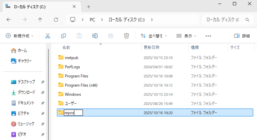 ここでは、C:\配下に"repos"というフォルダを作成しています。Subversionを使わない方は"svndummy"などの名前にしてもいいかもしれません。
