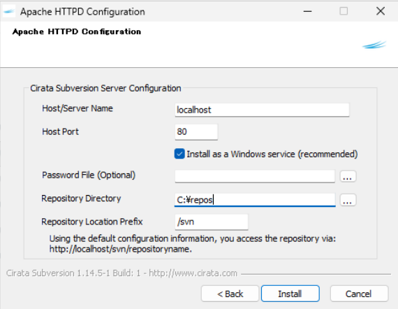 諸般の都合でSubversionをインストールします(Subversion機能付きApacheと考えてください)。Subversionの都合でデータを保管するフォルダを作成・指定する必要があります。