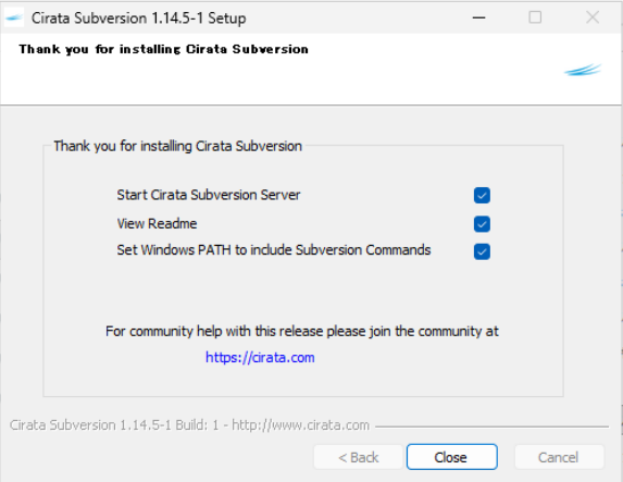 サービスを開始するかどうか、Readmeを読むかどうか、Subversionコマンドをパスに追加するか、が選択できます。特に支障がなければデフォルトのままCloseで。