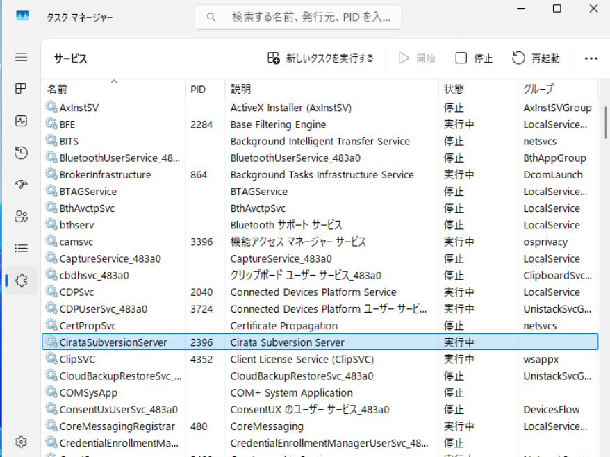 Windowsタスクマネージャーからサービスを見ると、"Cirata Subversion Server"ができています。これがApacheのサービスになります。