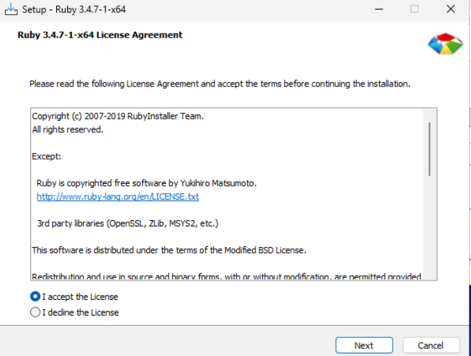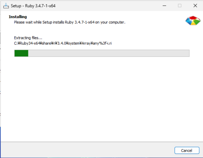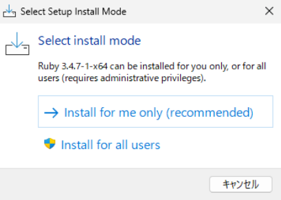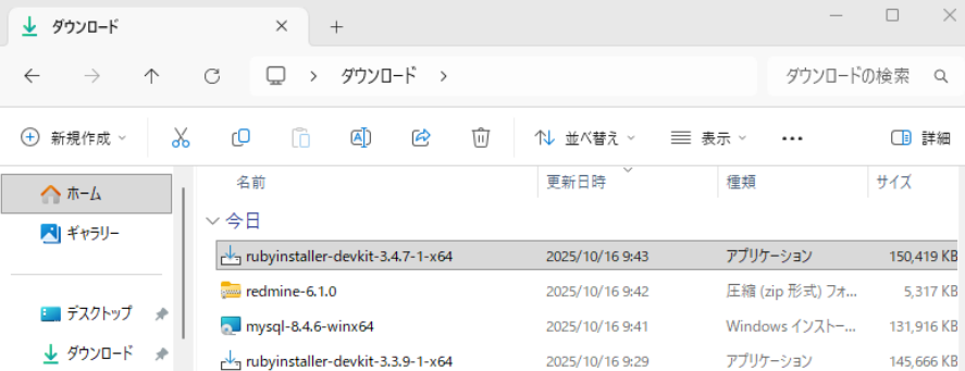 ダウンロードフォルダからRubyインストーラを起動します。ここでは"rubyinstaller-devkit-3.4.7-1-x64です。