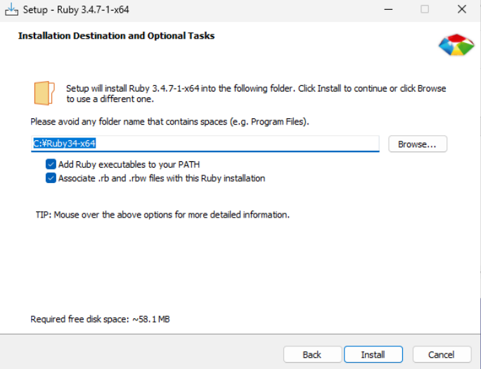 次にインストールフォルダを指定。ここではデフォルト(C:\Ruby34-x64)を選んで"Install"をクリックする。