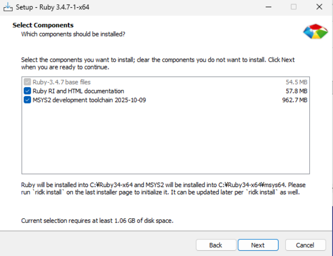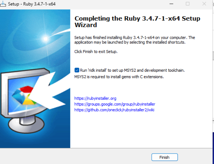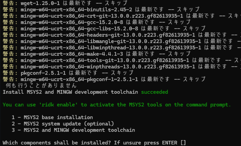 完了します。"Run 'ridk install' to set up MSYS2 and development toolchaimnのチェックを入れておきます(デフォルト)。
