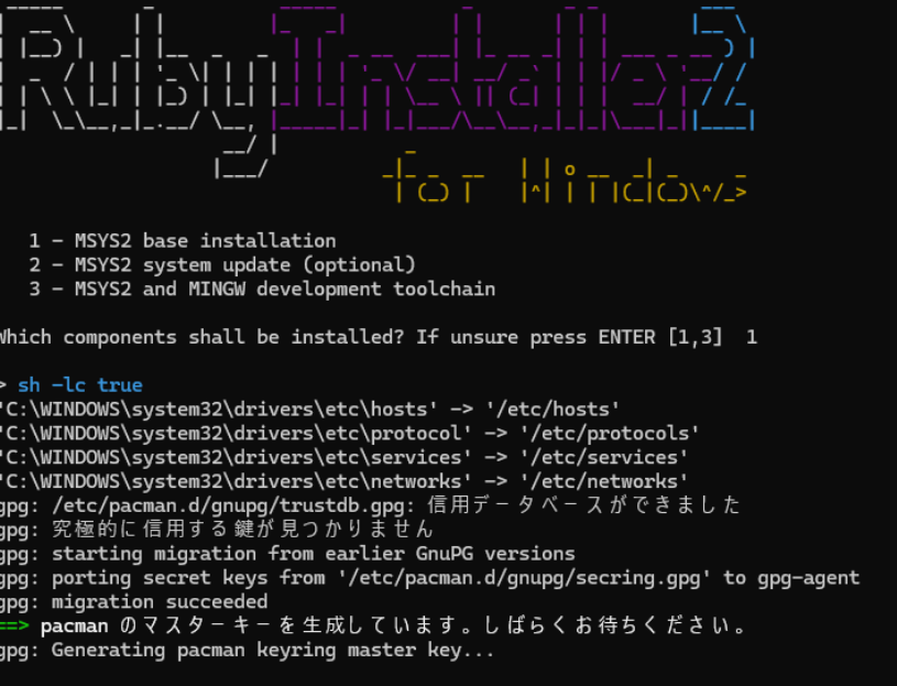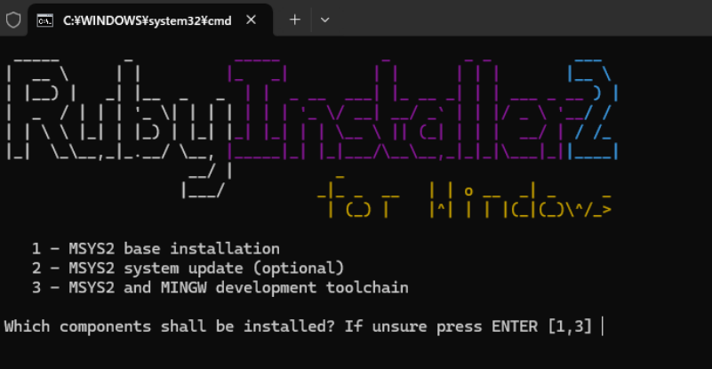 するとほどなくして、MSYS2のインストール画面が出ます。1, 2, 3 とメニューがあるが、この順番通り実行していきます。まず、"1"を押してリターン。