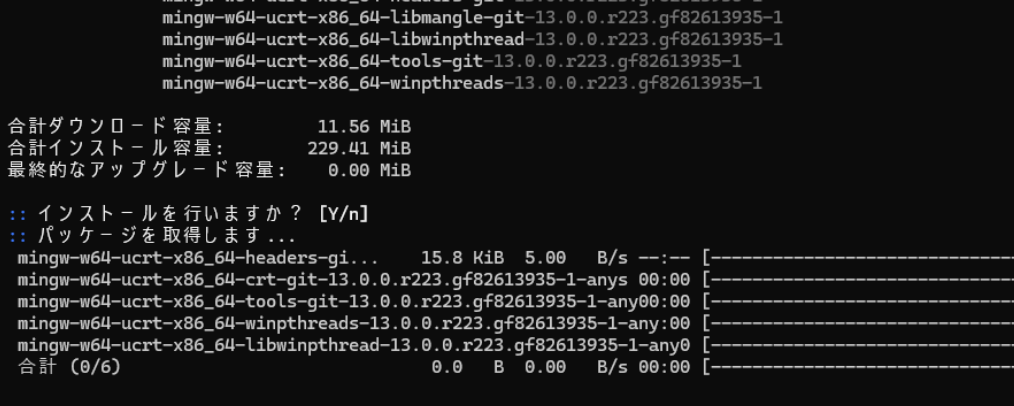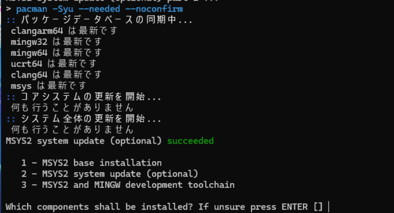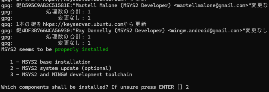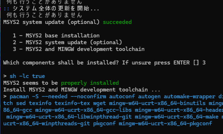 Install MSYS2 and MINGW development toolchain succeeded がでれば成功ですので、空でリターンすればインストーラが終了します。