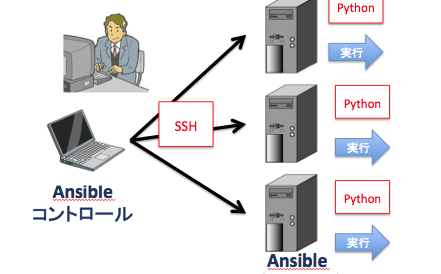 同ジャンルの著名なソフトウェアであるChefでは、実行ノードに対してエージェント・ソフトウェアをインストールする必要がありますが、Ansibleでは特別なソフトウェアは不要となっています。これはAnsbileが選択される非常に大きな要素となっています。